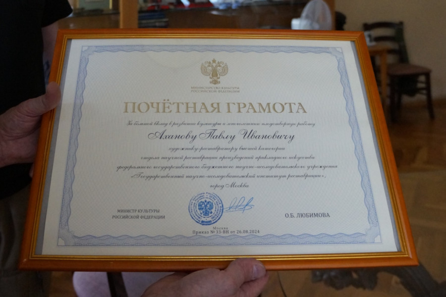 10 сентября 2024 г. в ГОСНИИР произошло торжественное вручение Почётной грамоты Министерства культуры Российской Федерации за большой вклад в развитие культуры и многолетнюю плодотворную работу Павлу Ивановичу АХАНОВУ!