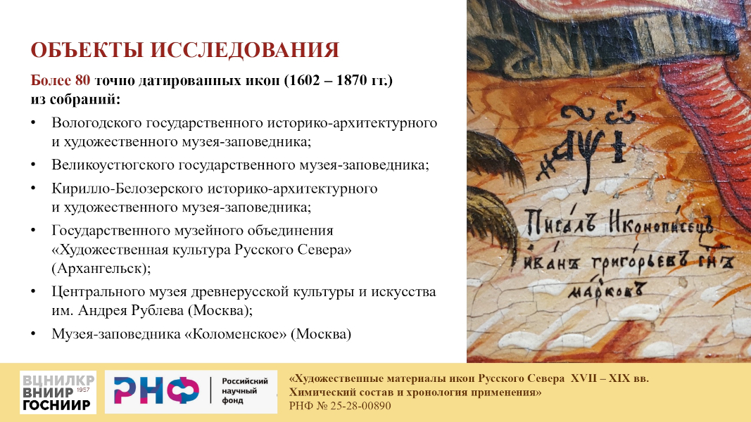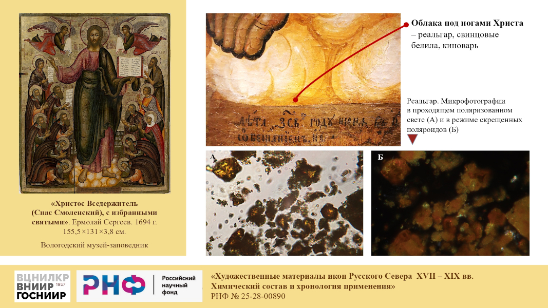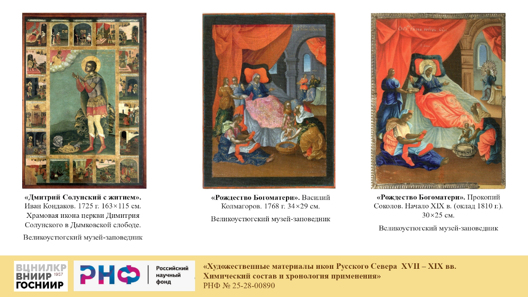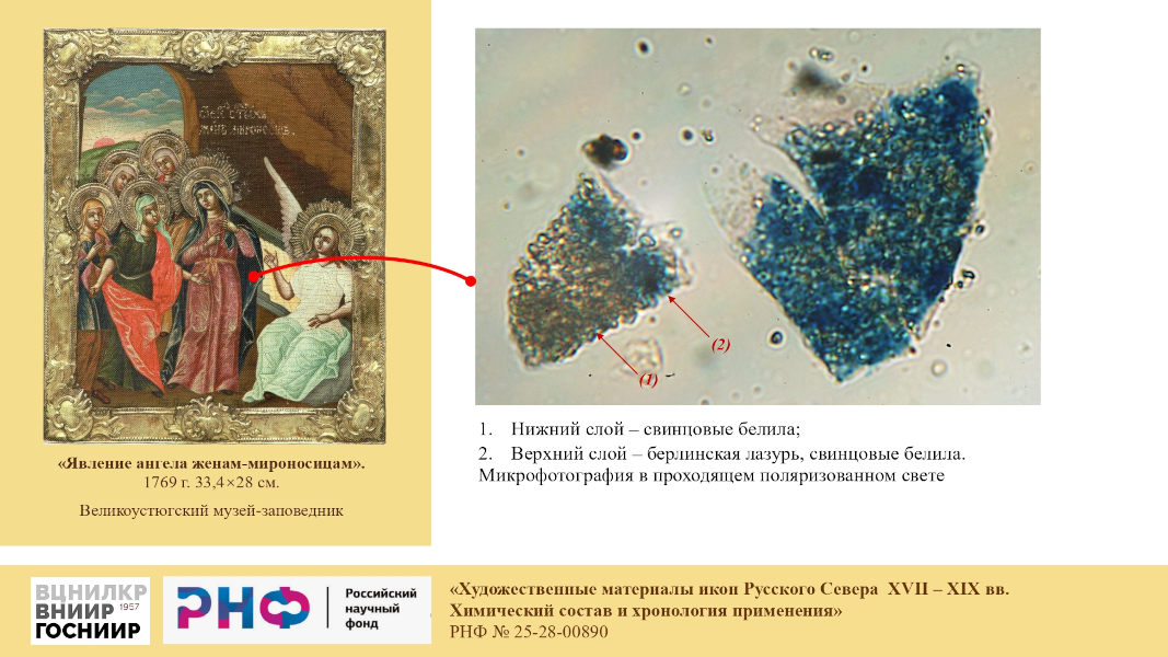 На мастер-классе были представлены результаты анализа пигментов иконописных памятников, полученные в процессе работы по проекту «Художественные материалы икон Русского Севера XVII-XIX вв.: химический состав и хронология применения», поддержанному Российским научным фондом (№25-28-00890).