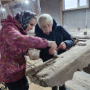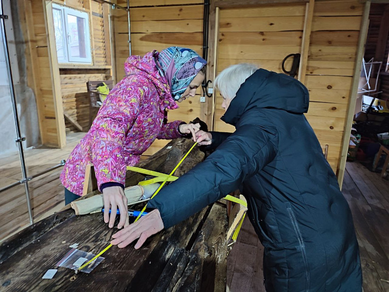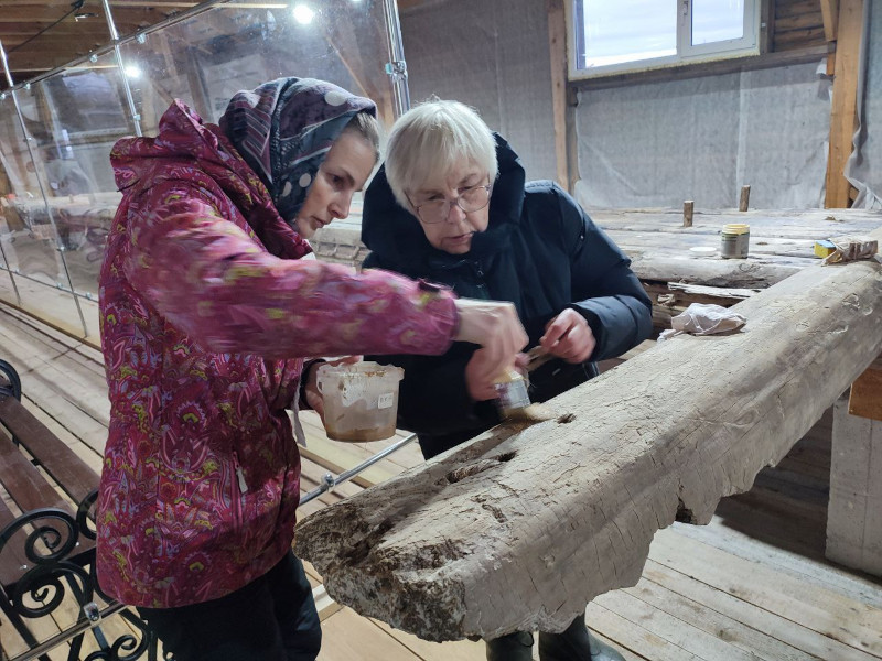 На прошлой неделе состоялась рабочая поездка научных сотрудников лаборатории химико-технологических исследований ГОСНИИР Валентины Ивановны Гордюшиной и Марии Владимировны Киреевой в Вытегорский объединённый музей, в котором продолжаются работы по консервации деревянной ладьи допетровского времени.