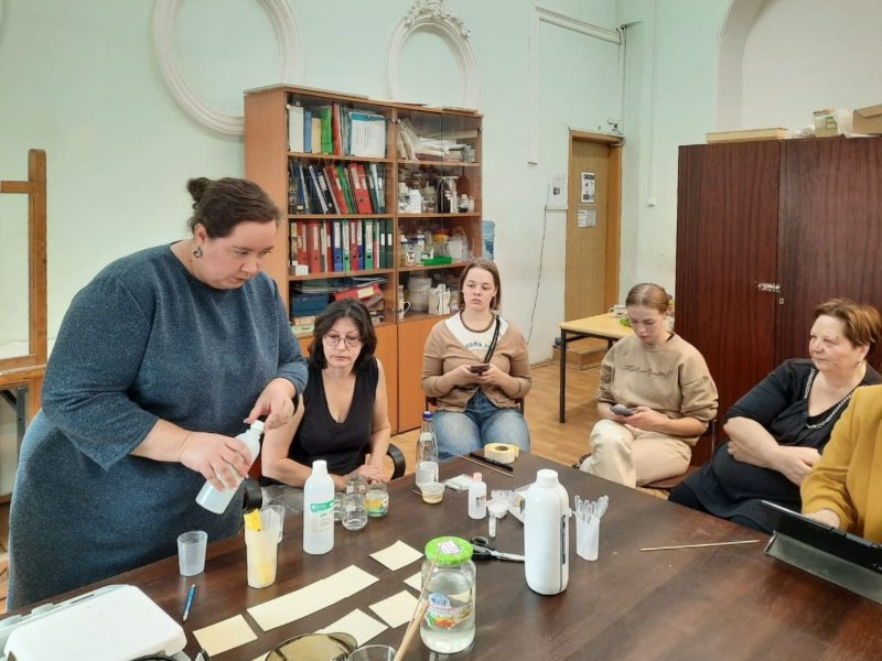 Мастер-класс был приурочен к завершающему этапу научно-исследовательской работы по удалению натуральных небелковых адгезивов из структуры произведений станковой масляной живописи.