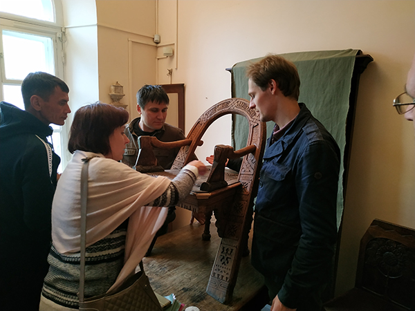 С разработанными на базе ГОСНИИР научными методиками, применяемыми при реставрации изделий из дерева, педагогов познакомили реставратор высшей категории И. В. Звиняцковский и главный хранитель ГОСНИИР Д. Д. Ковалев.