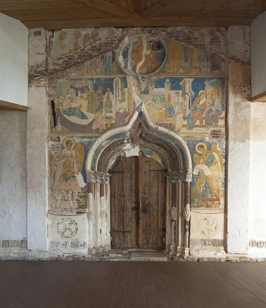 По всей поверхности росписей в соборе были удалены рыхлые поверхностные загрязнения и максимально утоньшены плотные слежавшиеся слои вместе с розовой кирпичной пылью. Из-за невозможности выполнить в полном объеме исследование техники живописи в различных участках спектра нами были выполнены пробные съемки в ИК-лучах для выявления из-под слоя поверхностных и биозагрязнений живописи. Съемки живописи и обследование ее в УФ-лучах позволило улучшить чтение угасших текстов на свитках и следы некоторых утраченных деталей живописи, но наиболее эффективна для совместной работы исследователей и реставраторов оказалась цветная макрофотография в М1=1 и микросъемка (12:1) отдельных участков красочного слоя росписей, которые можно считать вместе с результатами лабораторного анализа пигментов красочного слоя настоящим подходом к созданию полярной паспортизации росписи (см. доклад М.М. Наумовой в данном сборнике).